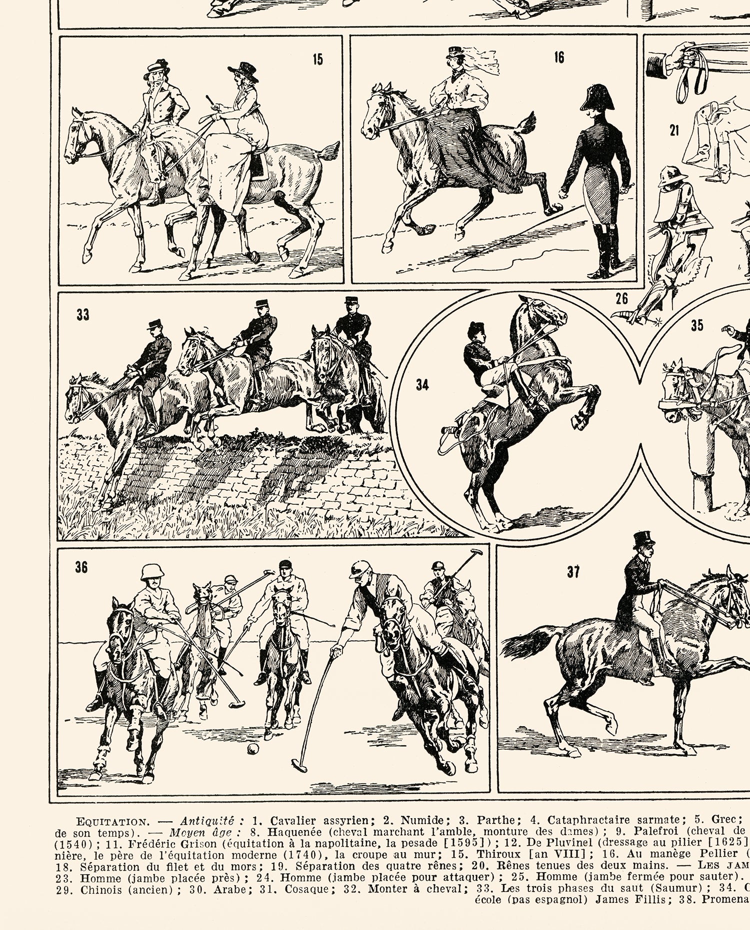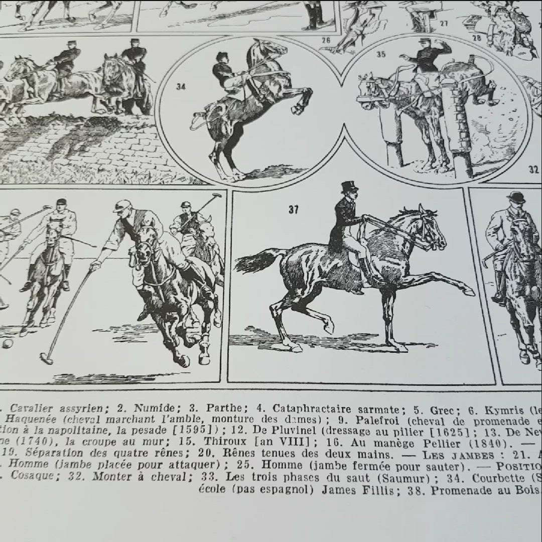 This poster was made by scanning an original 1936 horse riding print at very high resolution. The original print was intended to be seen at a much smaller magnification so that some printing defects, present in the original, may appear with a large size poster. I have chosen to keep these defects as they are part of the charm of these lovingly handcrafted antique prints.
