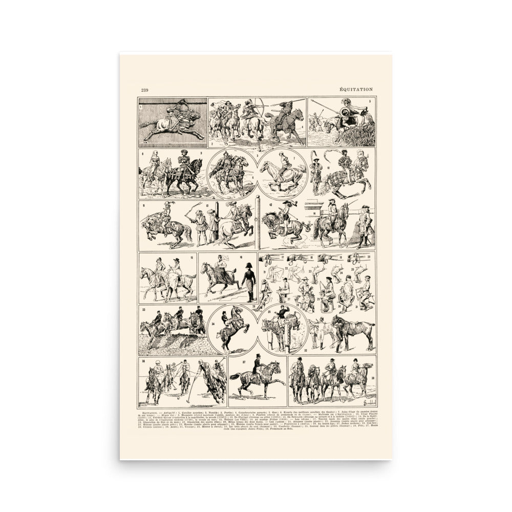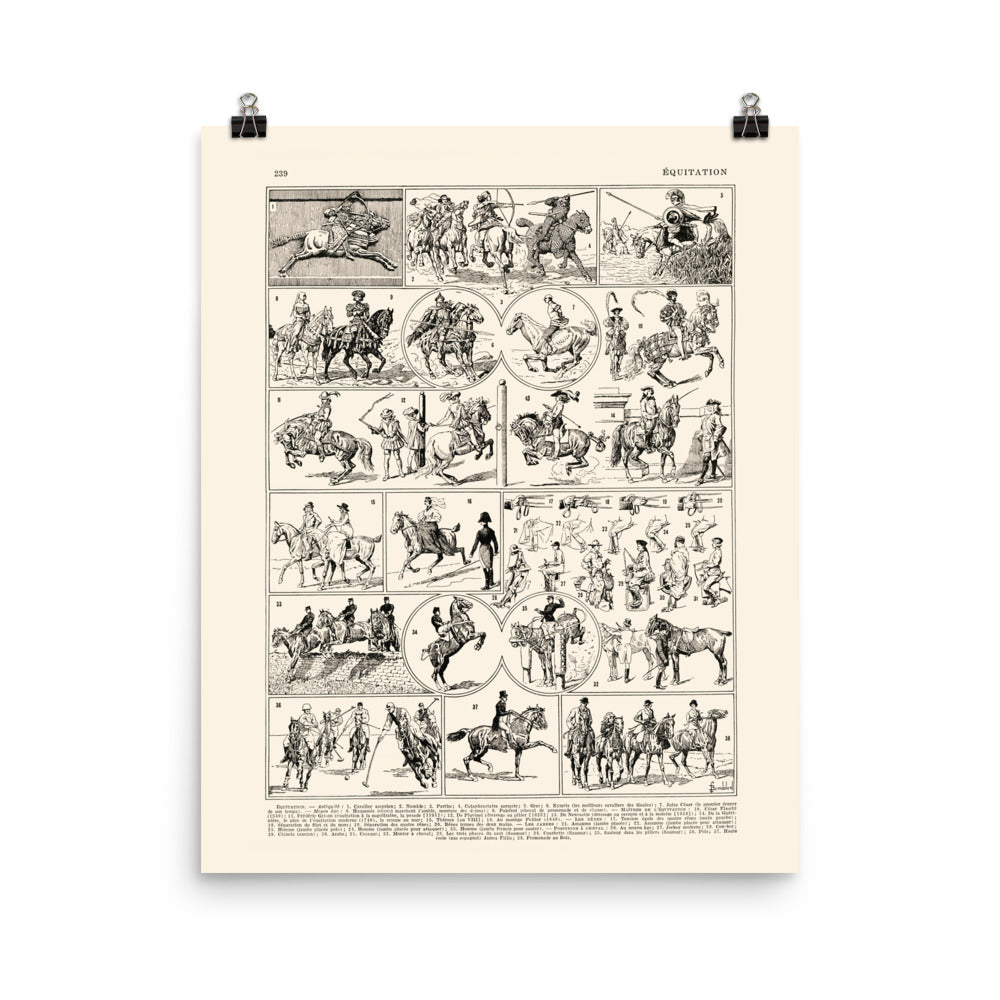 This is a high-quality contemporary reproduction of an antique 1936 dictionary plate, which illustrated the "Equitation" article (Equestrian art in French).