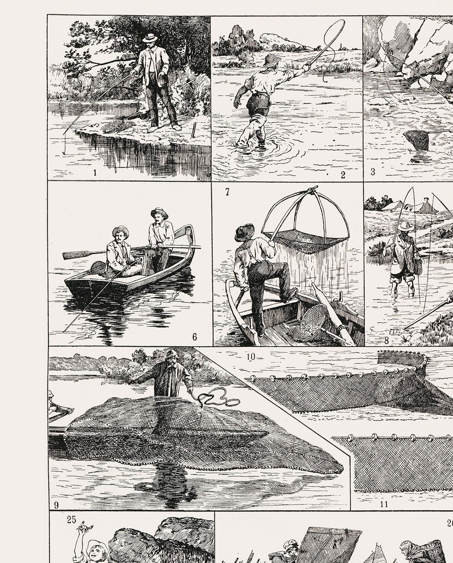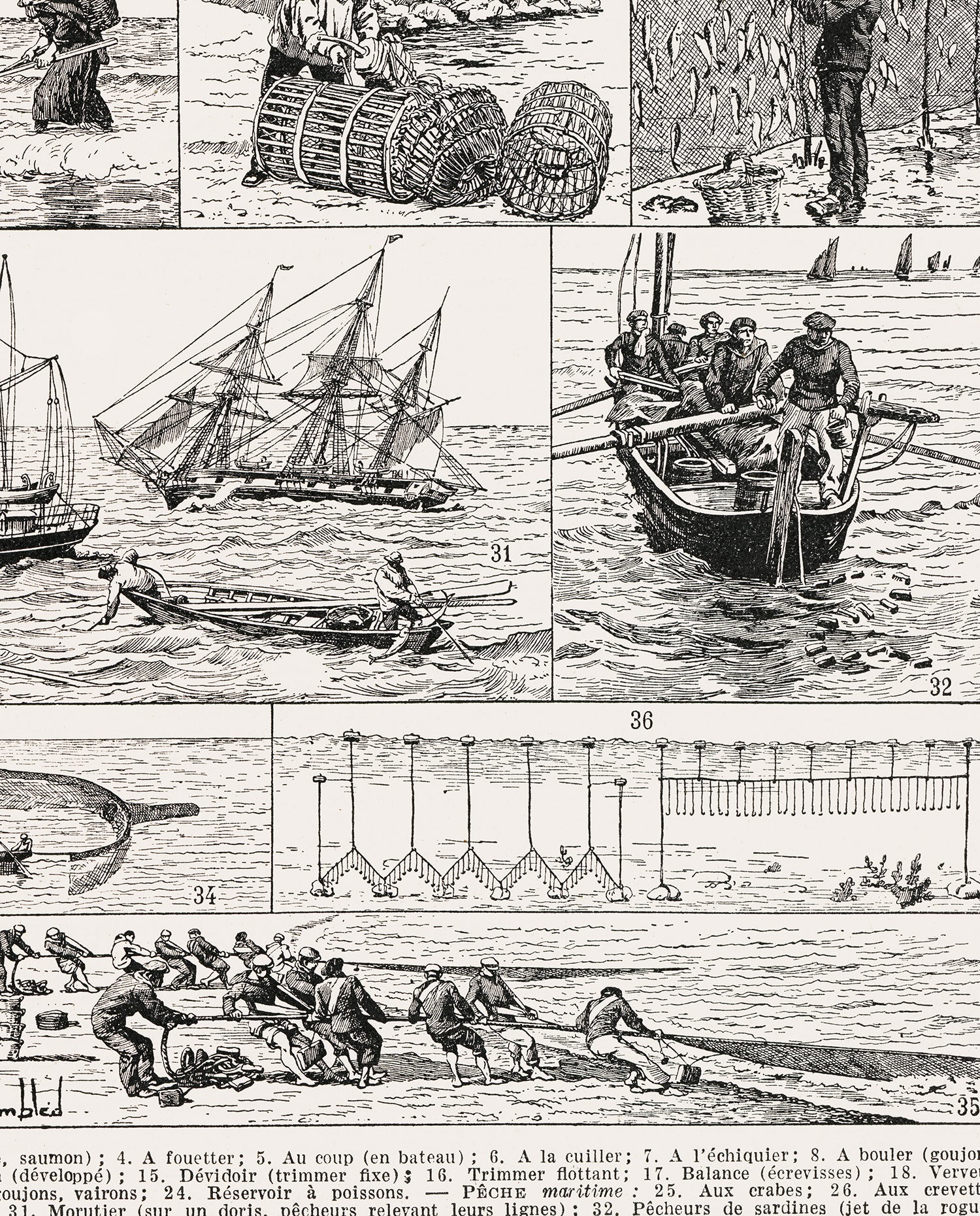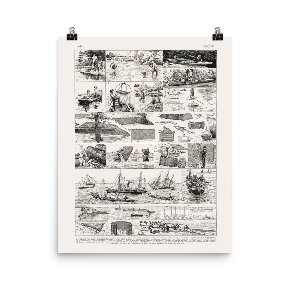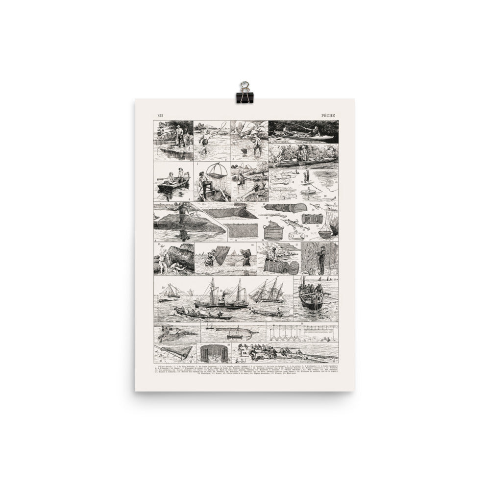 Each picture shows a different fishing techniques, from freshwater fly fishing to saltwater large net fishing and is identified by their French name at the bottom of the page.