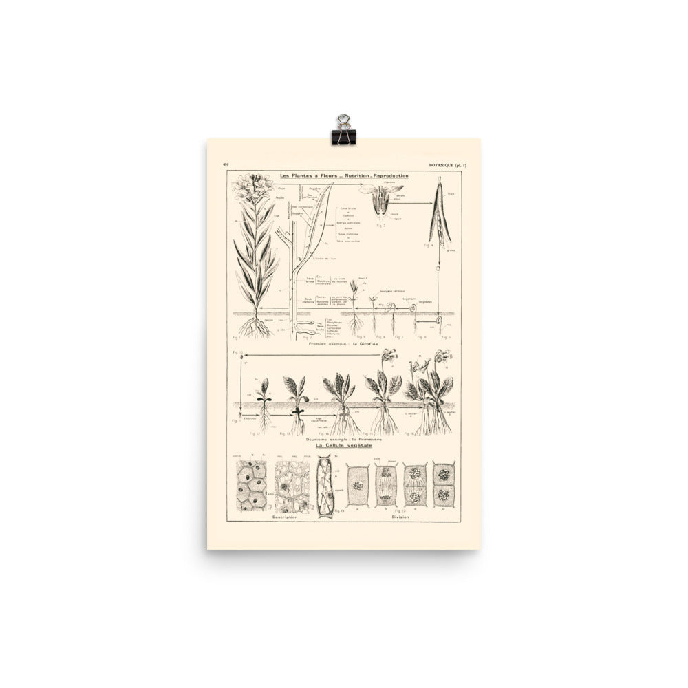 Created from a 1938 botanical illustration, this large poster shows the first plate of a series which illustrated the "Botanique" section of the Quillet dictionary. Its title is "Plantes à fleur: nutrition et reproduction", which translates to "Floral plants: nutrition and reproduction".