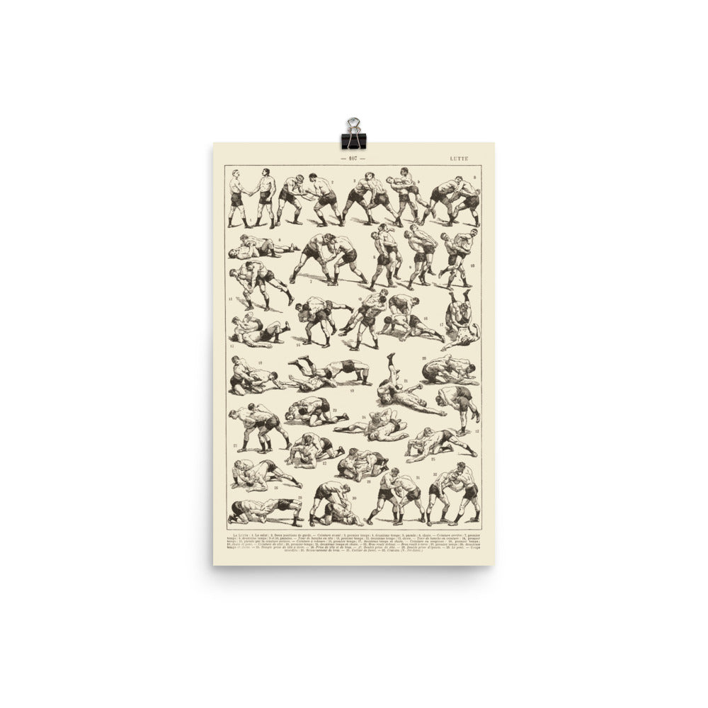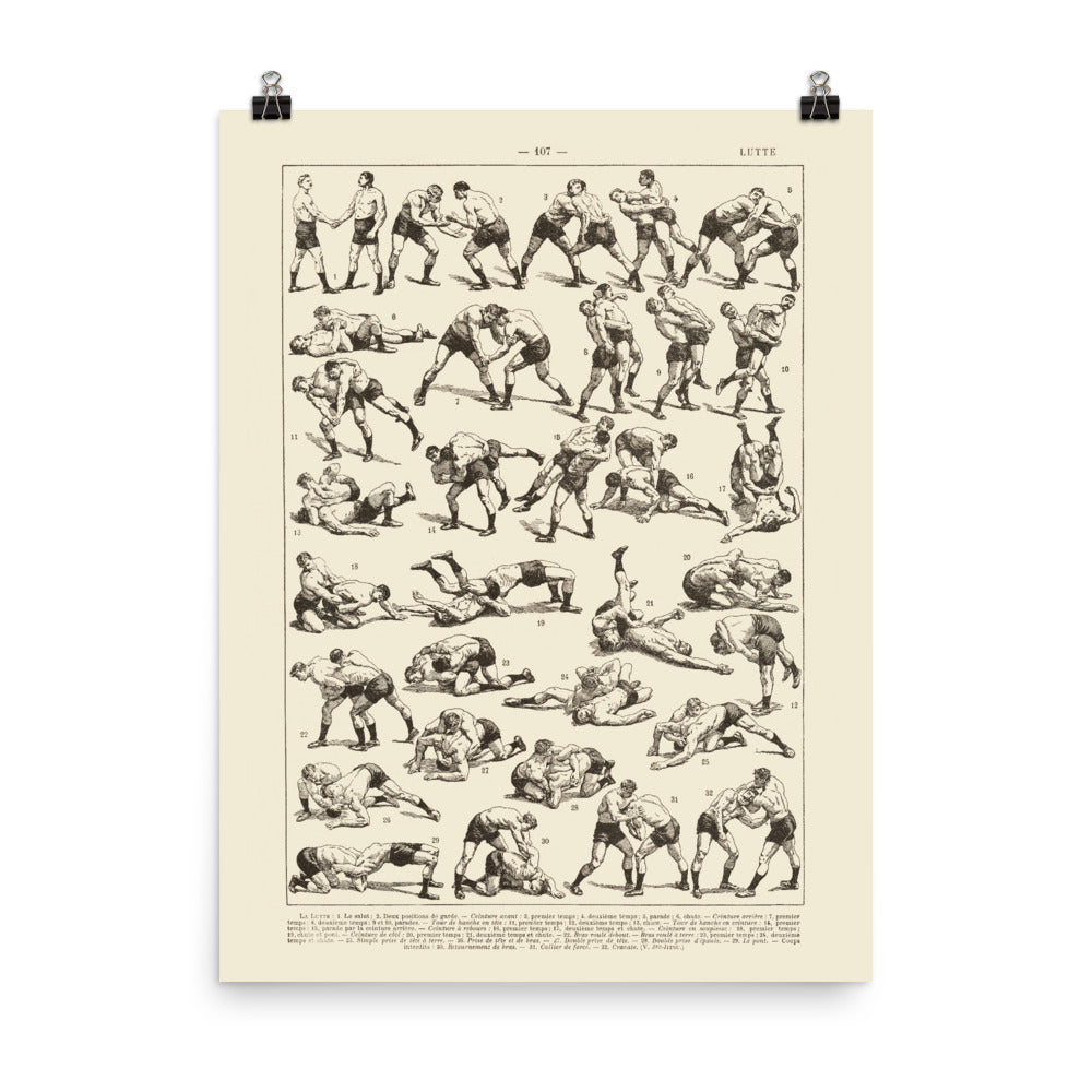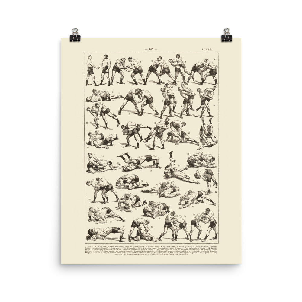 This beautiful large format reproduction of a 1897 vintage French wrestling poster will make them smile.ย This is a high-quality contemporary reprint of an antique dictionaty plate, which illustrated the "Lutte" article (wrestling in French).