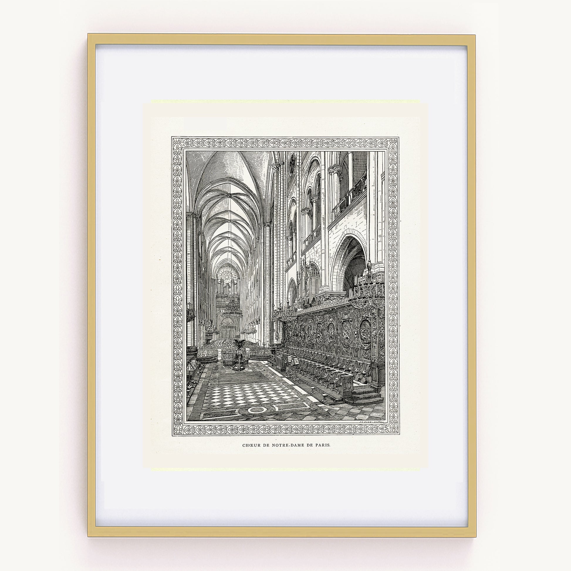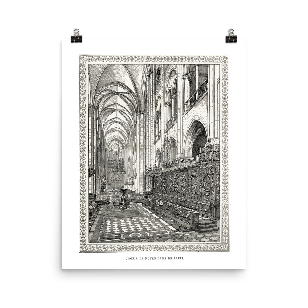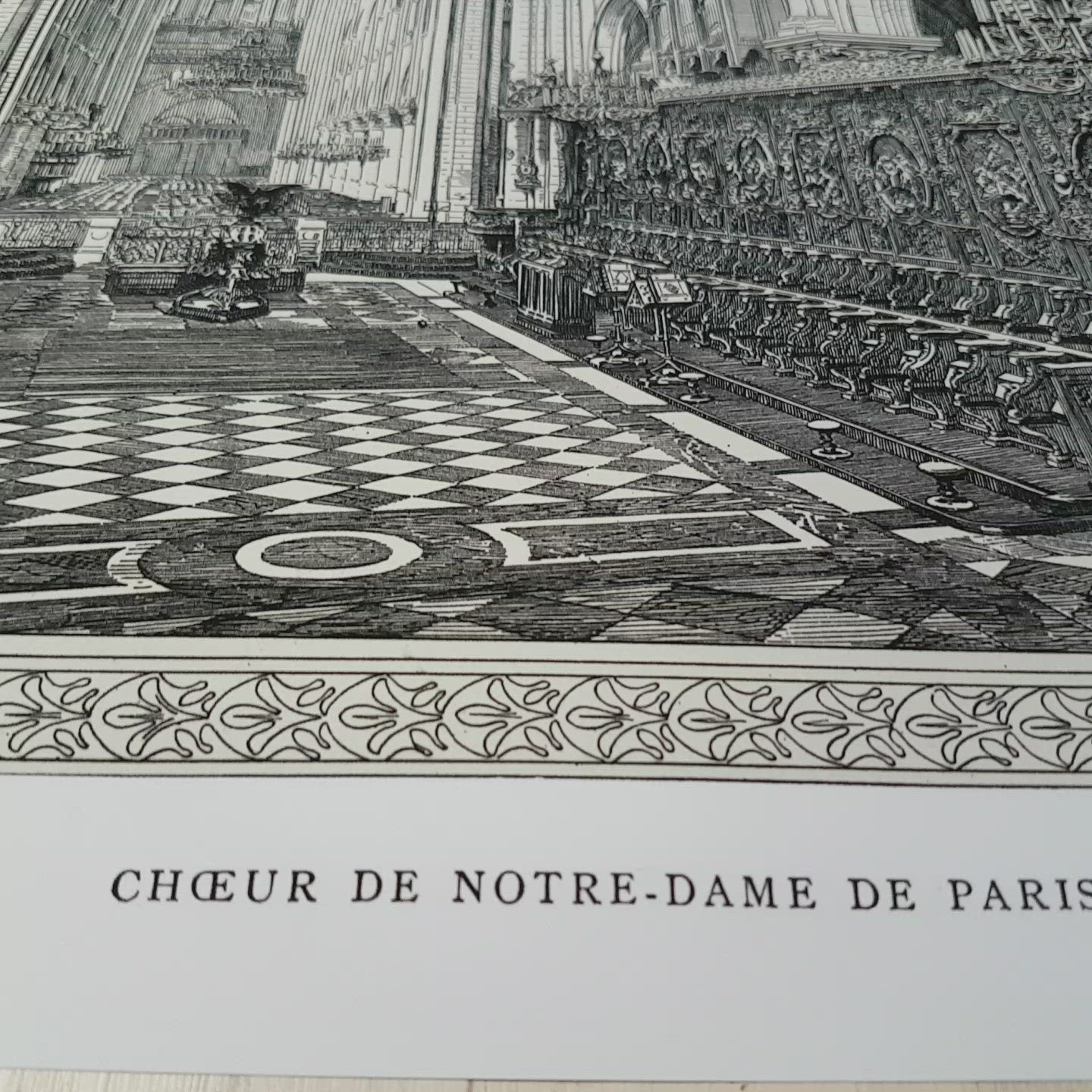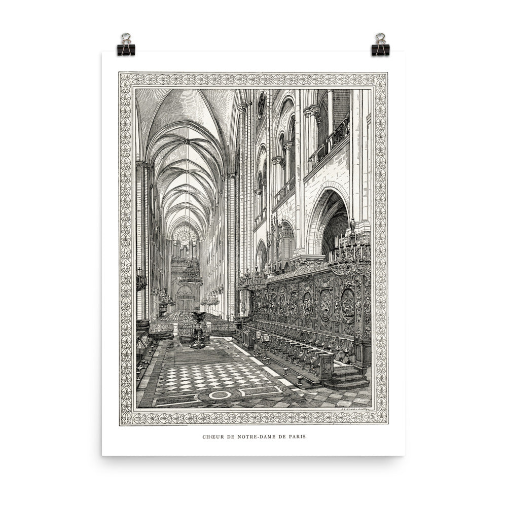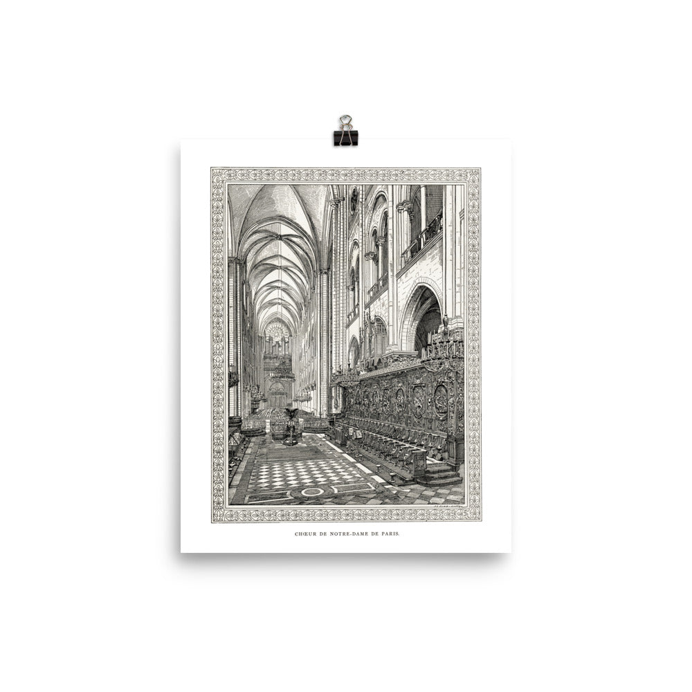This is a modern high-quality reproduction of a 1889 engraving by August Vitu, it shows the choir of the church, with its famous black and white marble checkerboard paving and the exquisitely carved pews, sitting under the high vaulted ceiling. The organ and the rose window are visible in the background.